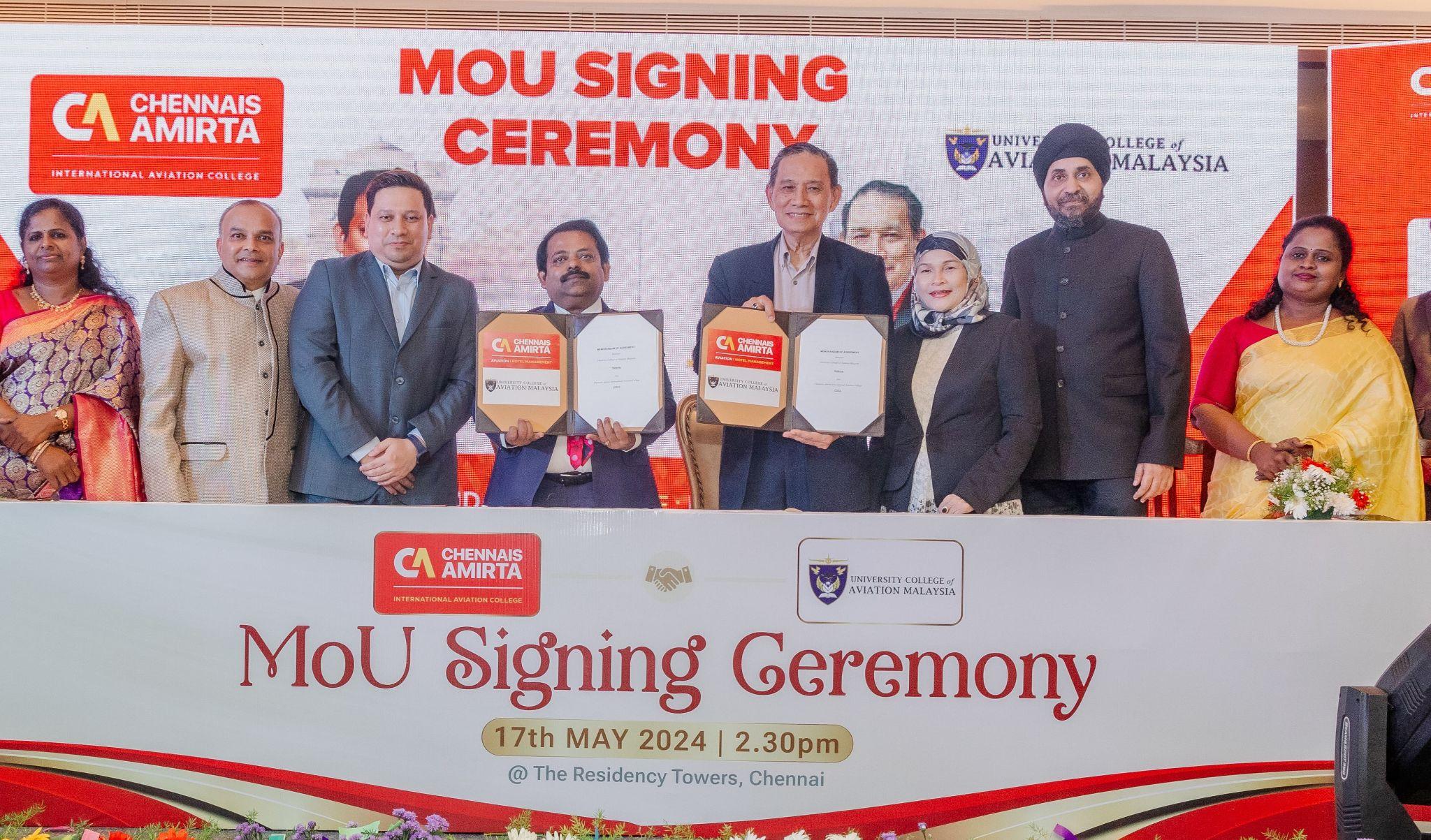 Mr. R. Boomenathan, Chairman of Chennais Amirta International Aviation College, expressed his enthusiasm forthis landmark collaboration, stating “We are the first college in aviation education to provide students with the opportunity fortraining atinternational airports during their studies. This type of MOU is unique Prof. Dr. Captain Ab Manan Bin Mansor, Chairman of University College of Aviation(UniCAM), Malaysia, Kalaiarasan, Founder, Tharshal Academy,Malaysia, Jainanak singh, Founder, Training minds, Malaysia remarked that this collaboration would elevate Aviation education to the nextlevel, offering Chennais Amirta students, the international exposure essential for their careers. He appreciated Mr. Boomenathan’s dynamism and initiatives for global educational