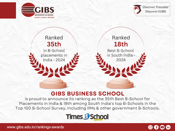 GIBS Business School is pleased to recognize its remarkable achievement in the Times B School Top 100 B-School Survey conducted by i3 Research Consultants. As proof of GIBS’ dedication to excellence, the school was placed 35th for Best Placements in India and 18th among top B-schools in South India based on an evaluation methodology known as the i3RC-BRM model, which evaluates institutions on three key dimensions – Resources, Effort and Outcomes.